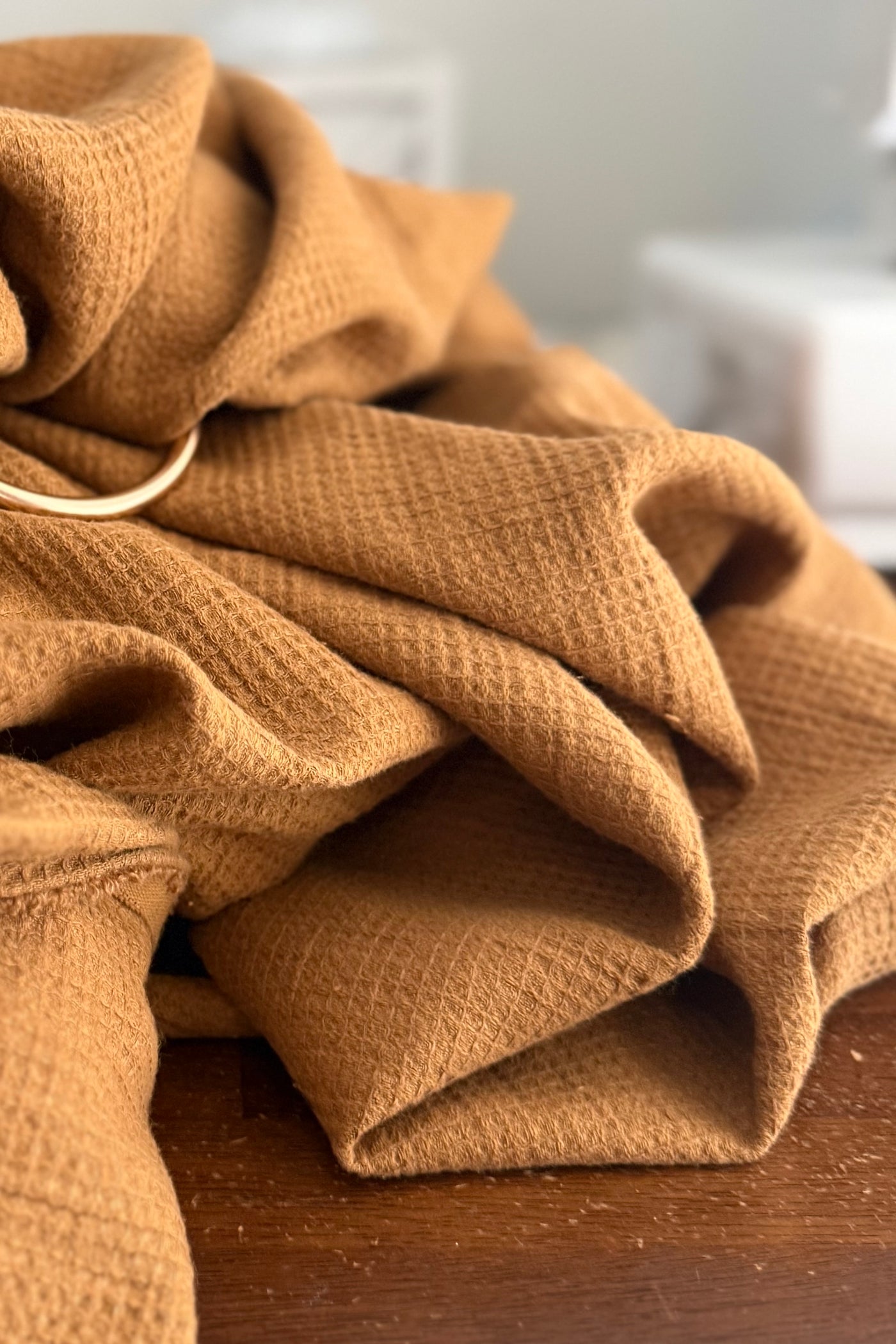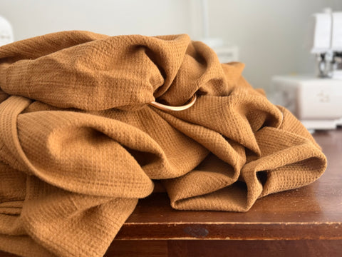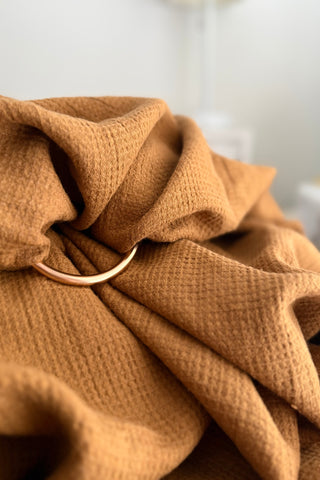 LoveHeld's Tucker woven ring sling baby carrier features a lovely warm brown tone. Exclusively woven from our linen cotton Feather Waffle Weave.