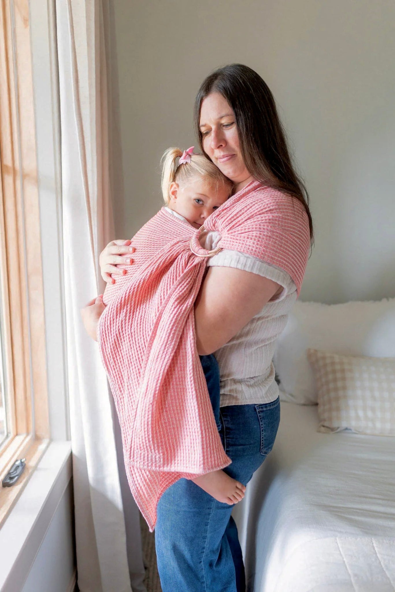 LoveHeld's Eliana ring sling baby carrier features a sunset pink inspired tone. Exclusively woven and handcrafted from our ultra-soft plush linen/cotton Signature Everyday Waffle Weave. Beginner friendly and perfectly suited for carrying sweet newborns weighing 8 pounds and up to giggling toddlers weighing 35 pounds in all climates.
