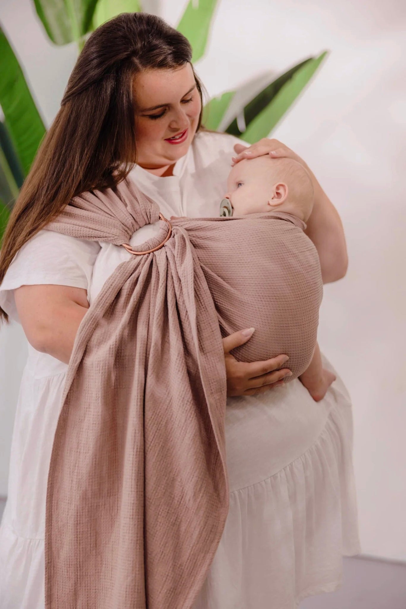 LoveHeld's Ella woven ring sling baby carrier features a dusty calming pink. Exclusively woven from our linen cotton Feather Waffle Weave.