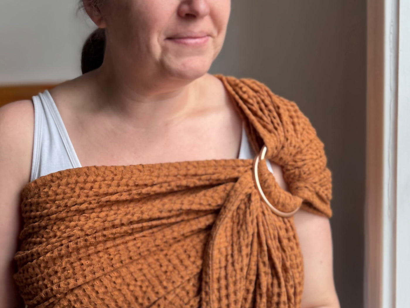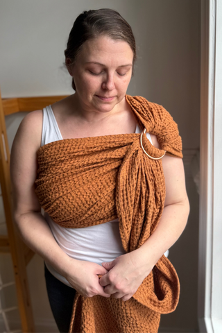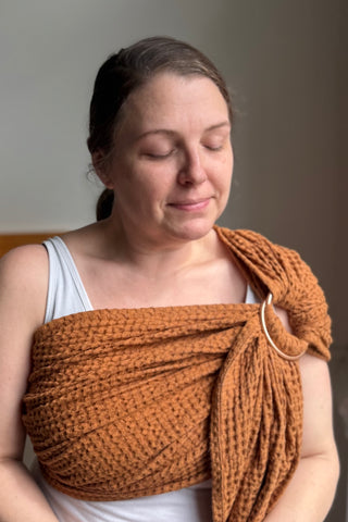 LoveHeld's Beatrice Susan ring sling baby carrier is a gorgeous autumn inspired pumpkin tone.