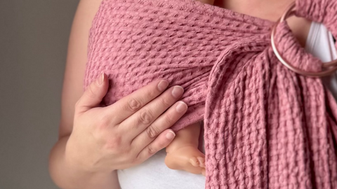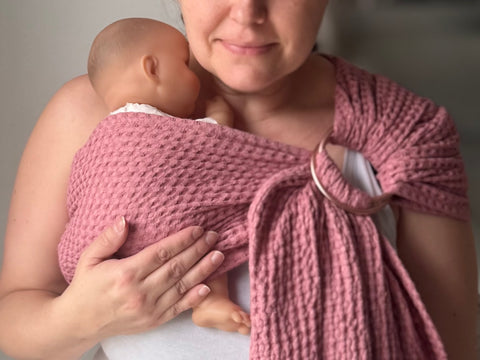 LoveHeld's Eli Lilith ring sling baby carrier is a beautiful autumn inspired pink tone.