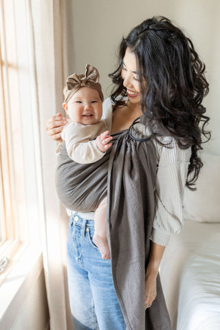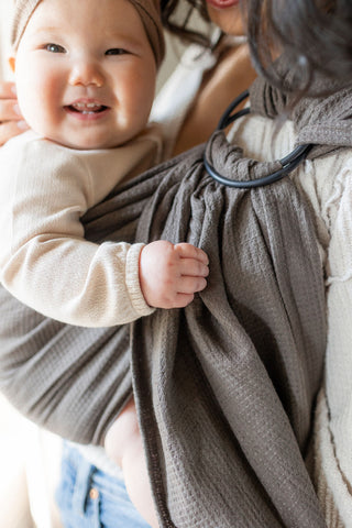 LoveHeld's Spencer woven ring sling baby carrier features a gorgeous woodland taupe tone. Exclusively woven from our linen cotton Feather Waffle Weave.