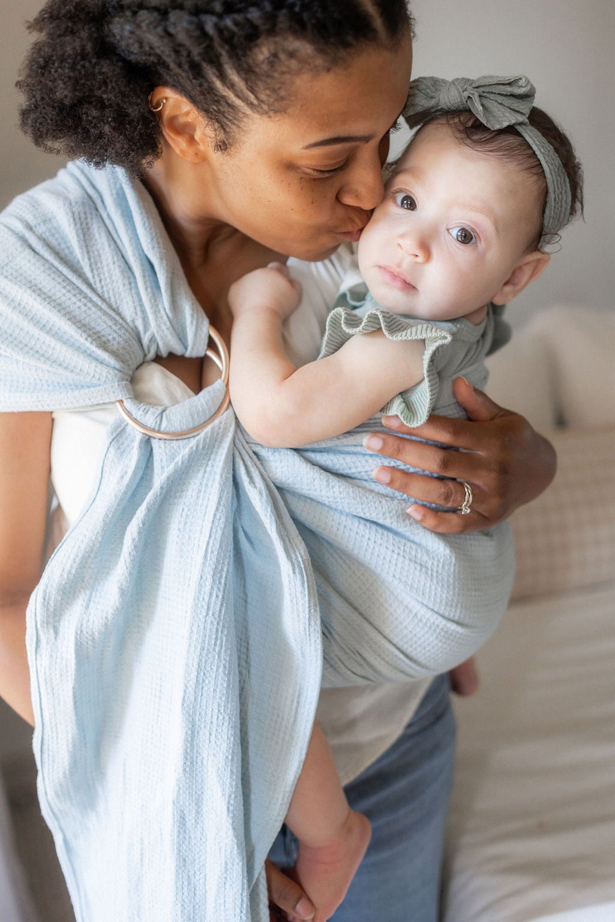 LoveHeld's Zoey woven ring sling baby carrier features a stunning icy blue. Exclusively woven from our linen cotton Feather Waffle Weave.
