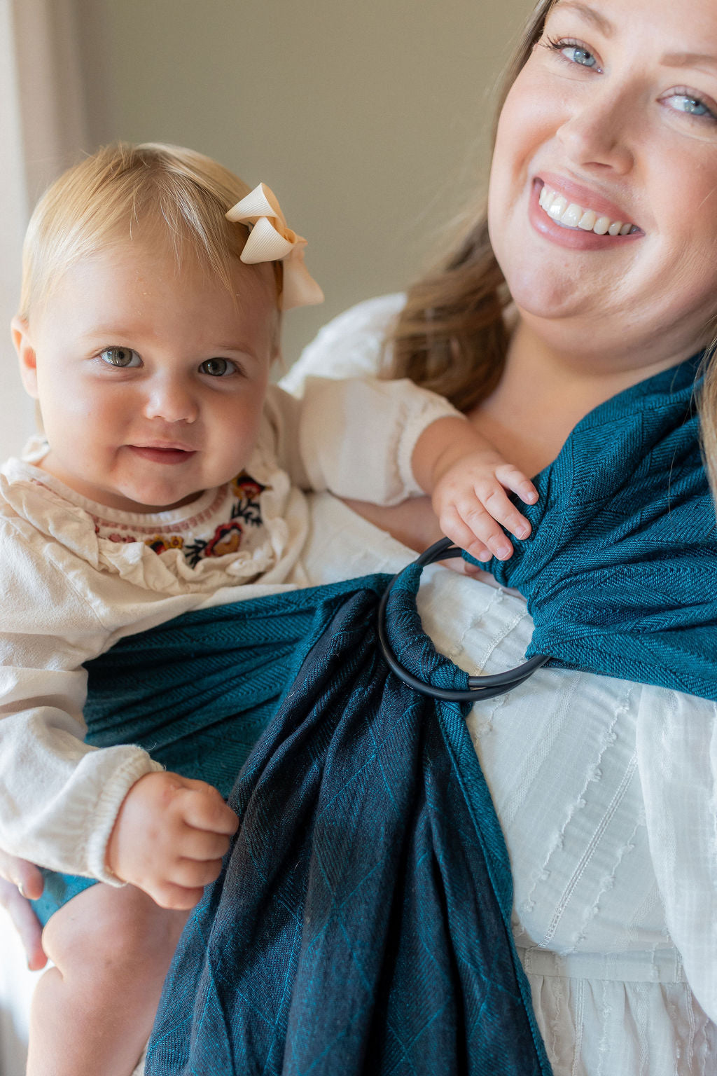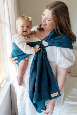 LoveHeld's Bryson woven ring sling baby carrier is a timeless design, featuring teal tones. Exclusively woven and handcrafted with great care from a single layer of woven Oeko-Tex certified 100% linen.